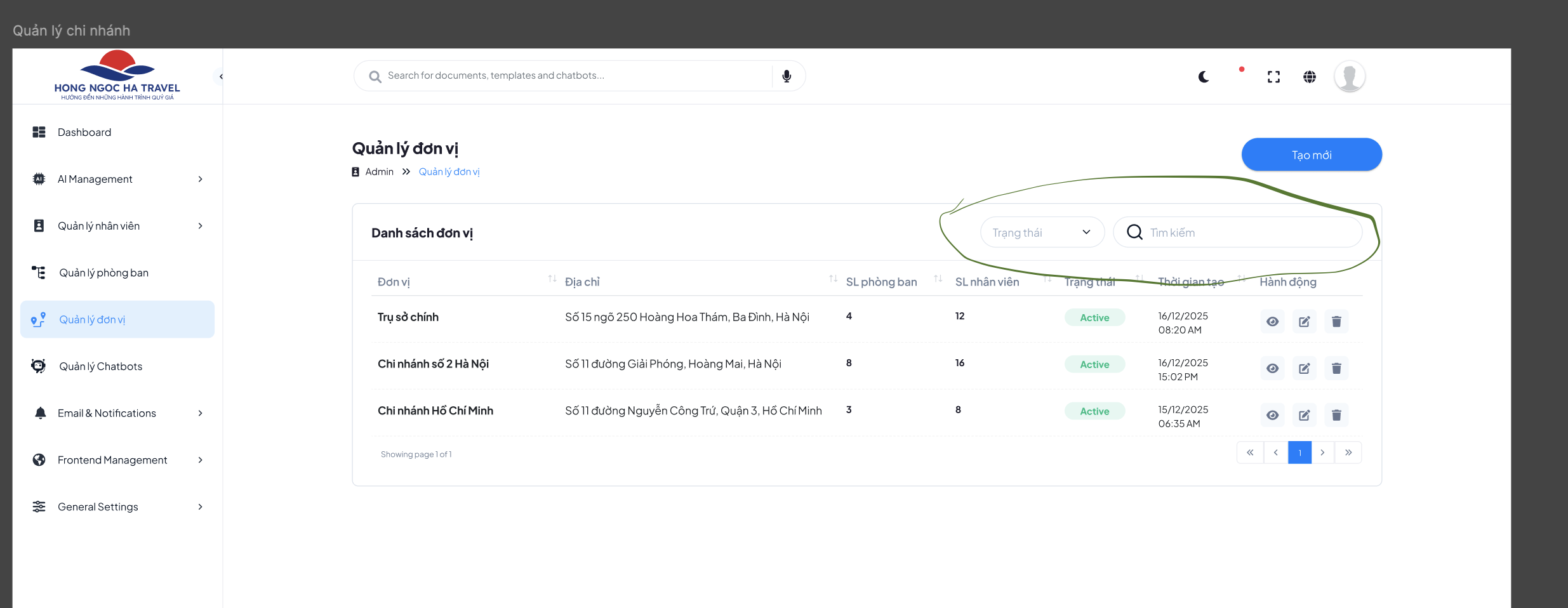 Quản lý đơn vị: Lọc theo Trạng thái, tìm kiếm theo Tên đơn vị