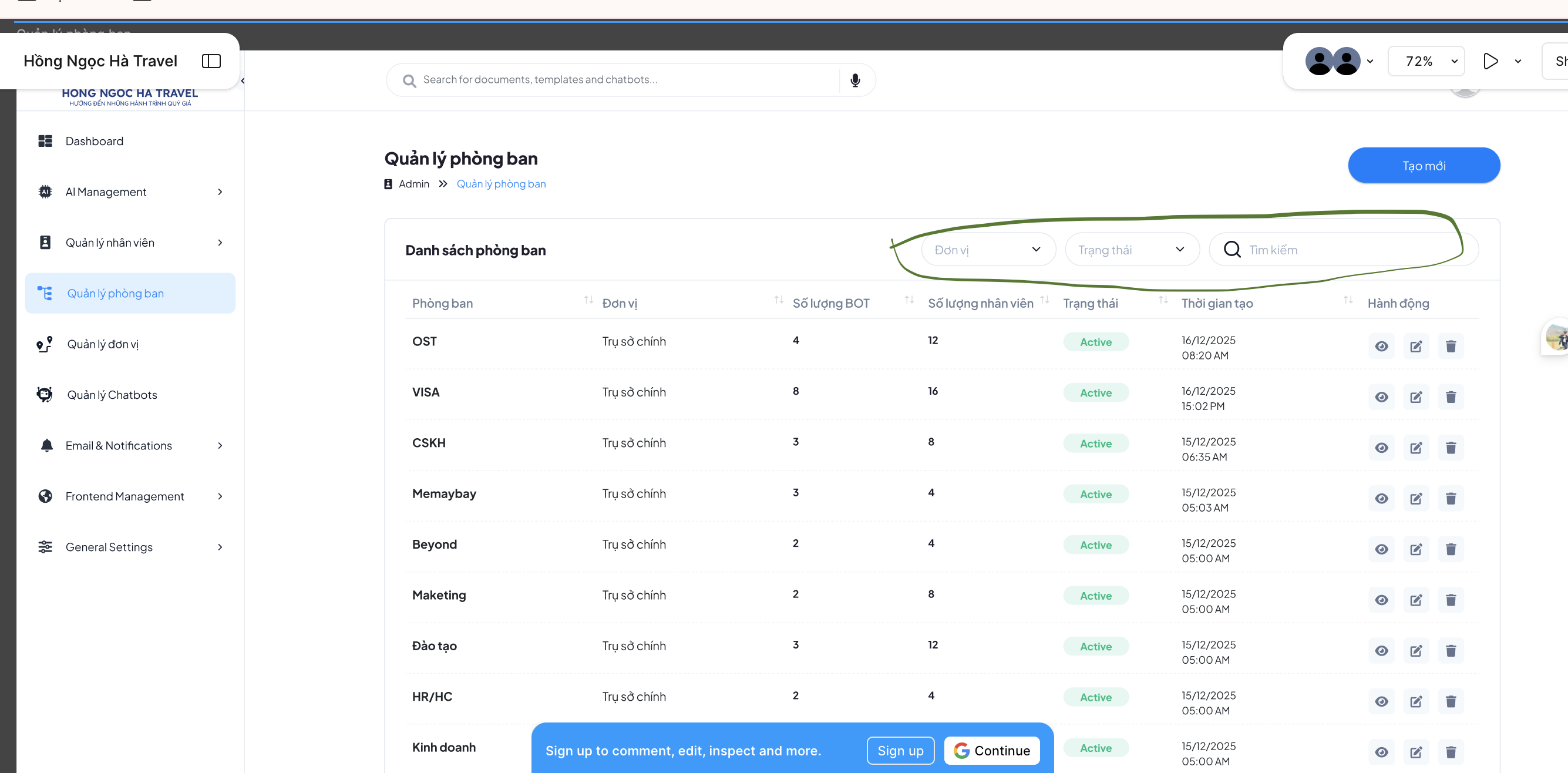 Quản lý phòng ban: Lọc theo Đơn vị, Trạng thái, tìm kiếm theo tên Phòng ban