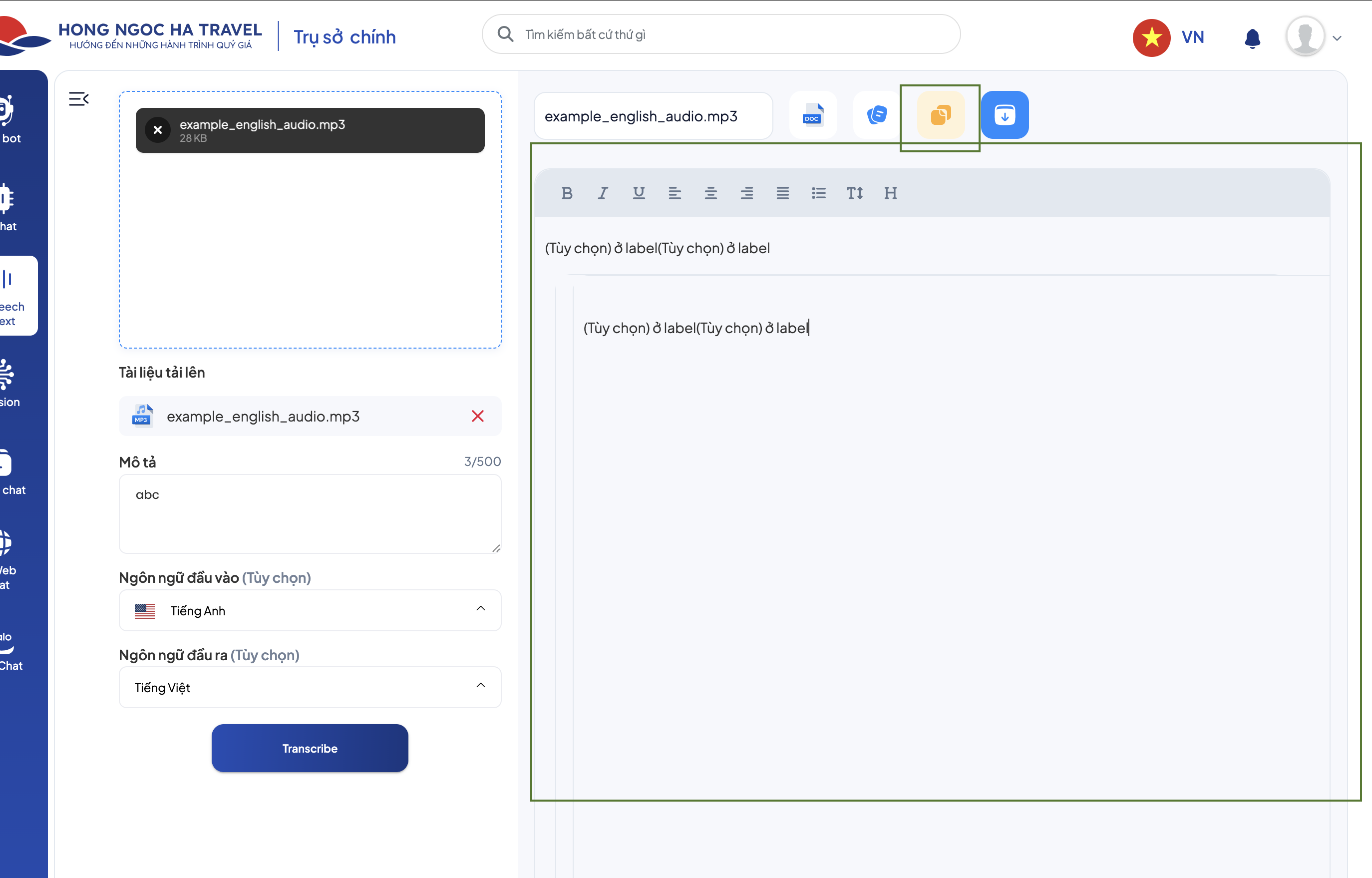 open[User][AI Speech to text]: Click sao chép đang sao chép cả khung Transcribe