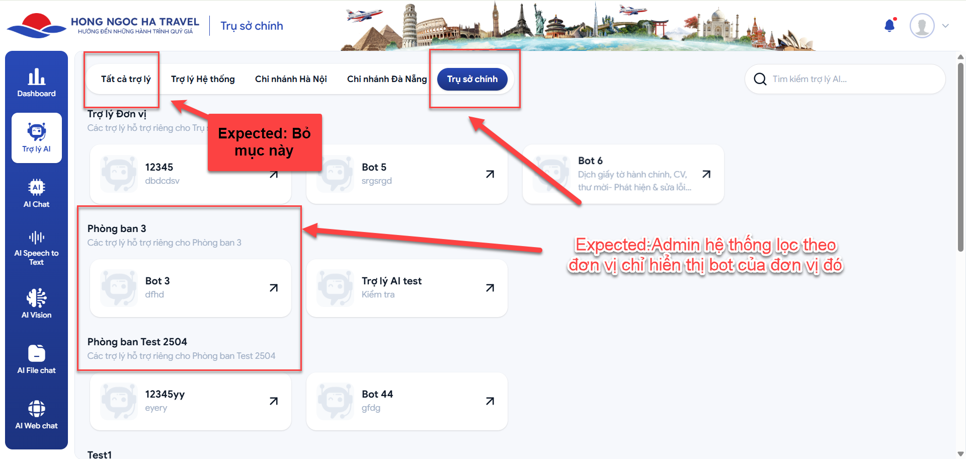Actual: Tab trợ lý hệ thống đang hiện cả danh sách bot của các phòng ban (như file đính kèm)