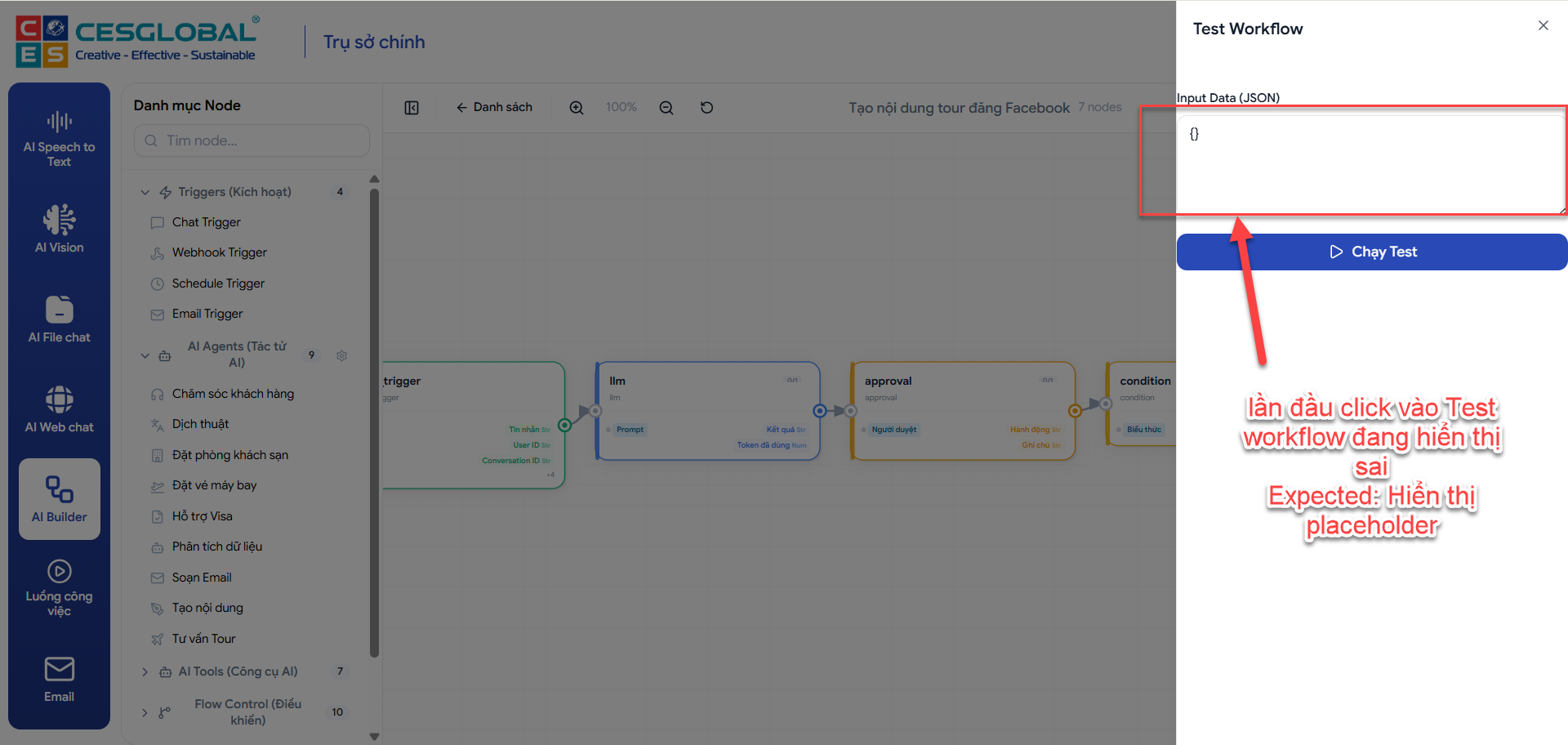 open[AI Builder] Click vào Test workflow đang hiển thị không đúng