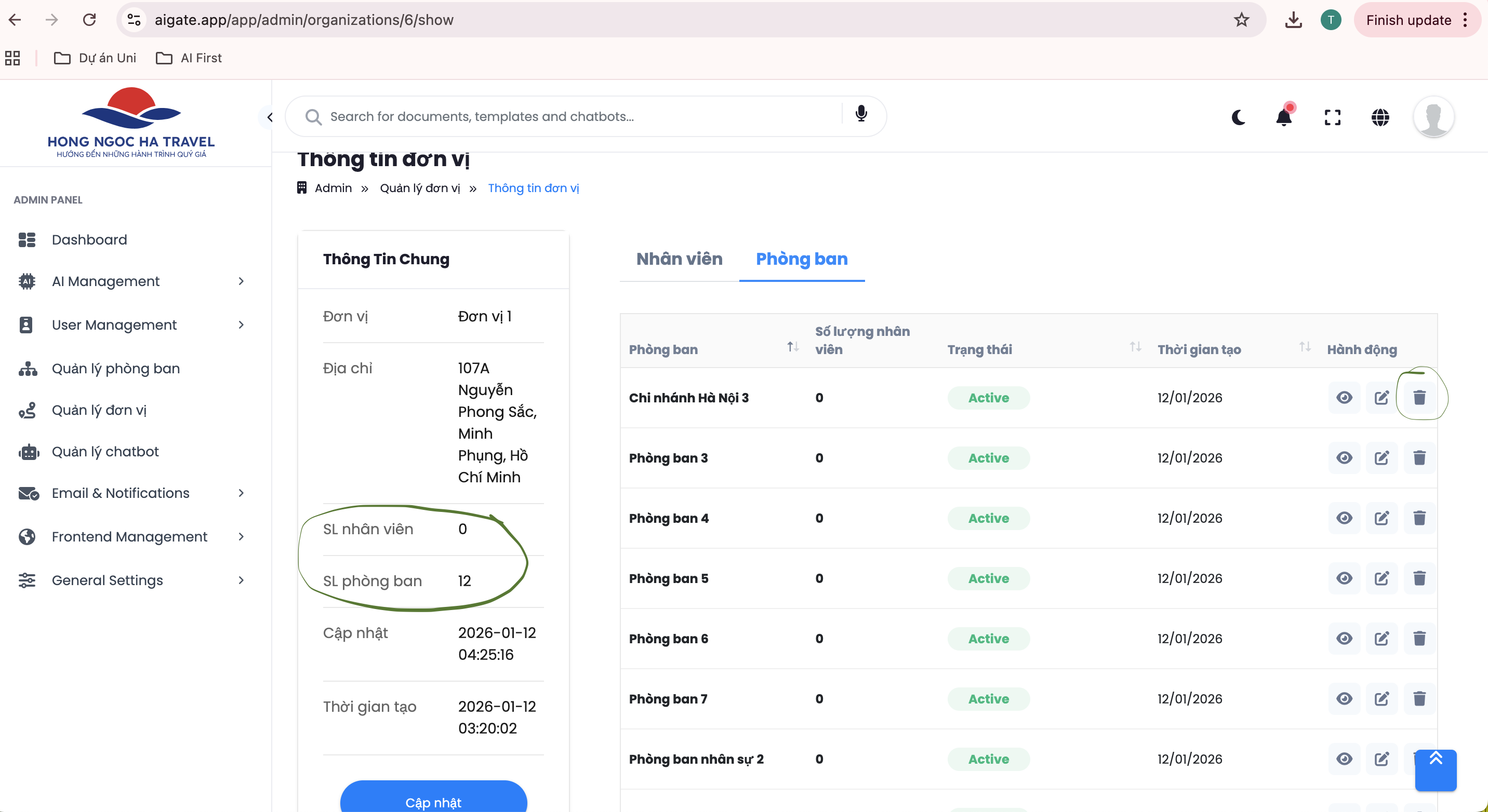 [Admin- Quản lý đơn vị] Màn chi tiết Đơn vị => khi cập nhật xóa Nhân viên/ Phòng ban cần update lại luôn SL ở Thông Tin Chung