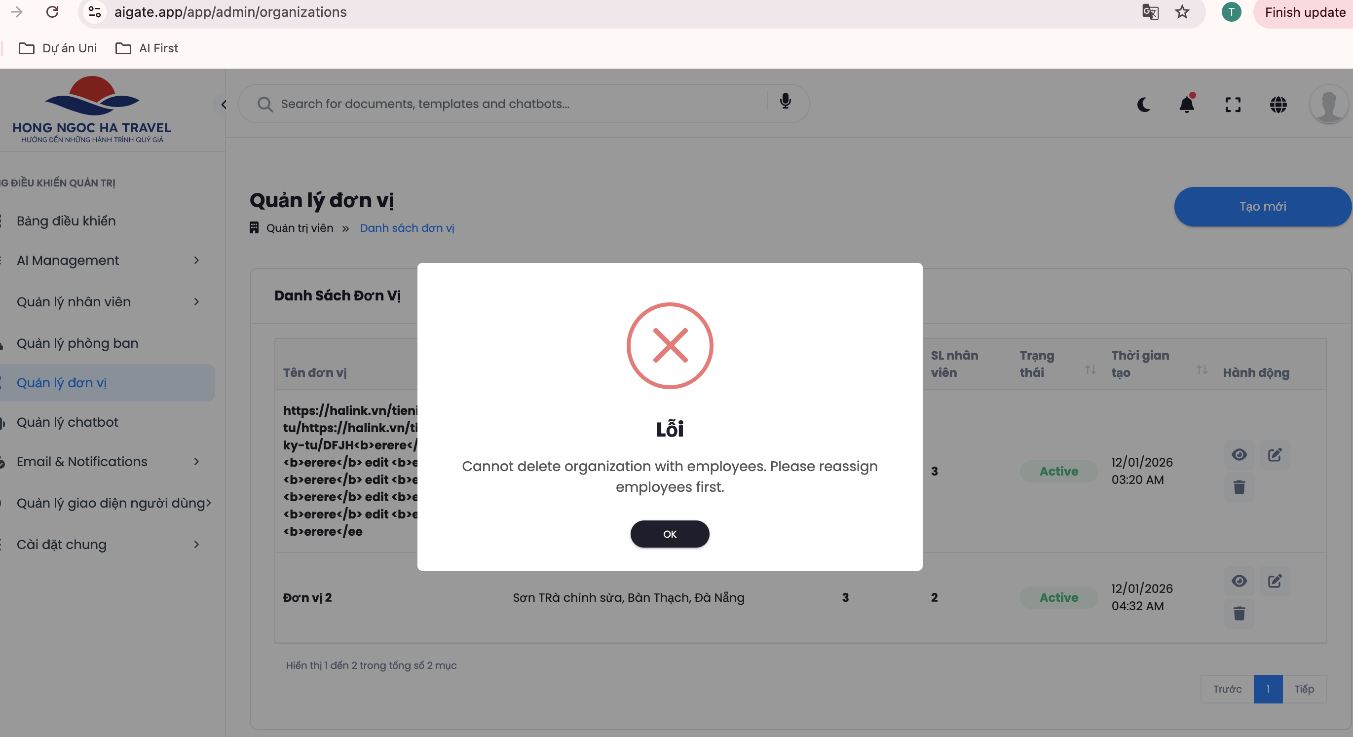 Sửa lại popup lỗi khi xóa Phòng Ban/ Đơn vị thành tiếng Việt: