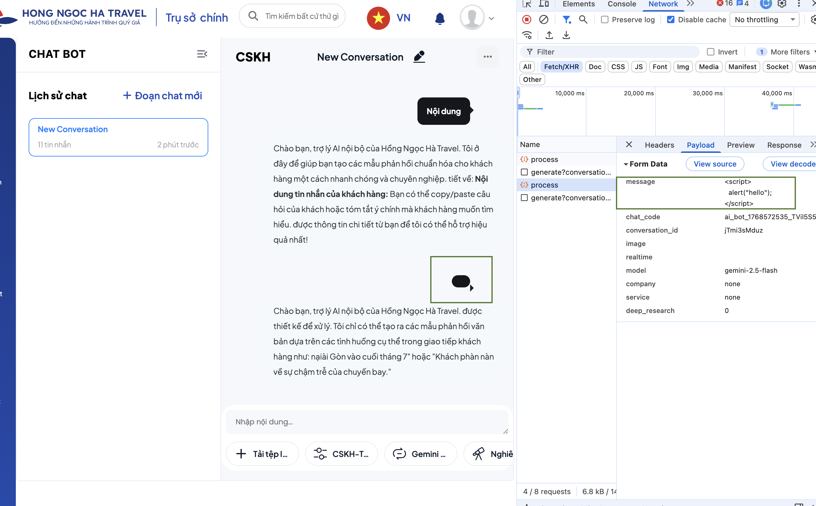 open[User][Chatbot phòng ban/ AI Chat]: Nội dung chat bị mã hóa / không hiển thị khi nhập HTML/ Script