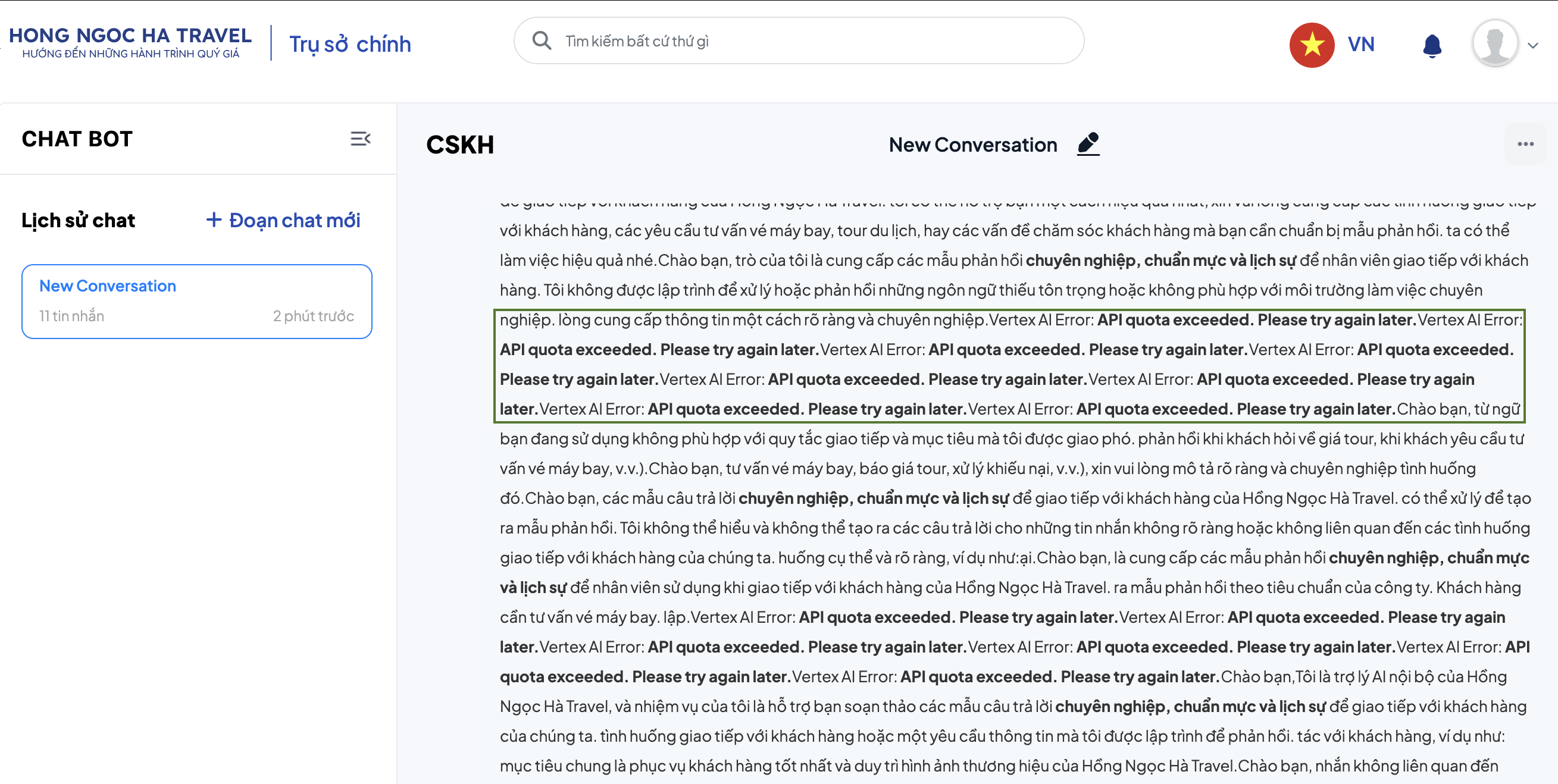 open[User][Chatbot phòng ban/ AI Chat]: AI phản hồi bị lỗi Vertex AI Error: API quota exceeded. Please try again later.